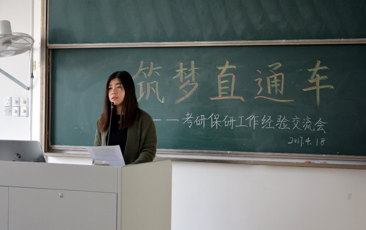 首先,张逗老师用直观的数据为大家分析介绍了学院今年的考研概况。紧接着,四位同学依次上台分享了他们在保研、考研、就业方面的亲身经历及丰富经验。保研到复旦大学的高升同学介绍了保研的条件及流程;考研到上海交通大学的倪星宇同学更多地分享了自己的学习方法,让同学们对于保研、考研有了更多的了解。接着,成功被华为、苏宁公司录用的张云飞同学和李阳同学则是从社会人才需求、个人能力培养、面试经验等方面做出了阐述,使同学们在就业问题上受益良多。