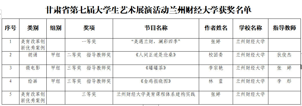 近日,以“厚植国家情怀,涵养进取品格”为主题的甘肃省第七届大学生艺术展演活动结果揭晓,在本次比赛中,beat365在线唯一官网荣获优秀组织奖,报送的美育案例及多项艺术作品喜获佳绩,学校美育教育成果实现了新突破。