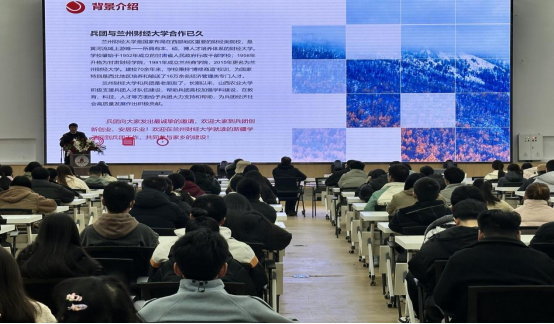 宣讲会上,大家共同观看了新疆生产建设兵团宣传纪录片,对当地总体情况及生活工作环境有了初步了解。兵团宣讲组负责人李学明介绍了新疆生产建设兵团在国家发展战略的重要作用及兵团的历史和发展,着重强调兵团在安边固疆、发展前景广阔、安全稳定宜居宜业、敬才爱才求贤若渴等方面的特点,还讲解了兵团事业单位招录政策和兵团国有企业招聘政策,对当地生活、医疗情况,以及晋升机制、福利待遇等相关政策进行了详细介绍。