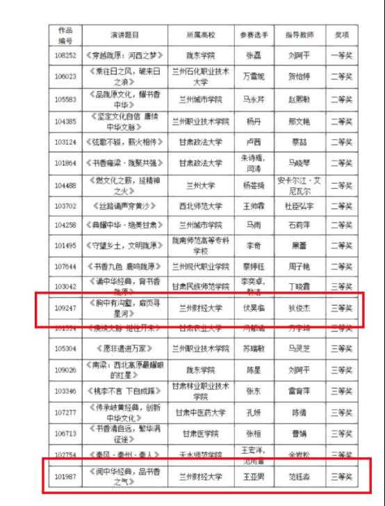 近日,甘肃省教育厅语言文字工作委员会办公室公布了“典耀中华 书香陇原”全省大中小学生主题演讲获奖名单。本次比赛由甘肃省教育厅主办,兰州文理学院承办,来自甘肃省百余所大中小学的选手参赛,分为小学、初中、高中、高校四个组别进行演讲比赛,共有167件作品。beat365两名学生荣获高校组三等奖两项,展现了beat365青年学子昂扬向上、奋发进取的精神风貌。
