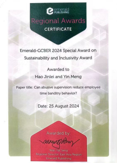 beat365工商管理学院郝金磊教授、会计学院教师马虎兴讲师、经济学院教师马国栋助教参会并分别作了《管理失范对员工时间侵占行为的影响》《百年变局下中国参与全球经济治理的机遇、挑战及应对策略》《生产要素价格对中国制造业国际竞争力的影响》的交流发言。同时,郝金磊教授的论文荣获英国著名学术出版机构爱墨瑞得(Emerald)集团联合博特拉大学颁发的2024年可持续性和包容性特别论文奖。