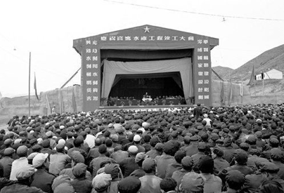 1954年5月13日,新中国成立后建设的第一座大型山谷水库——永定河官厅水库宣告建成。时任水利部部长的傅作义到现场讲话,并将毛泽东主席亲笔题词的锦旗授予水库的建设者们。