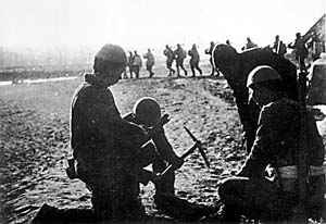 电影《地道战》:地道战嘿地道战,埋伏下神兵千百万,嘿埋伏下神兵千百万,千里大平原展开了游击战。村与村户与户地道连成片,侵略者他敢来,打得他魂飞胆也颤,侵略者他敢来,打得他人仰马也翻!